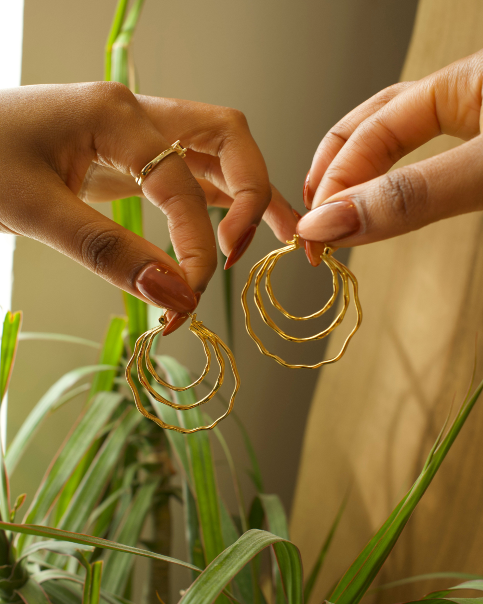 Signature Wave Hoop: Three wavy hoop stacks in one seamless piece. The ripple effect catches the light just right, creating movement without a single part actually moving. These hoops are designed to make a statement yet feel effortless enough for everyday wear.
