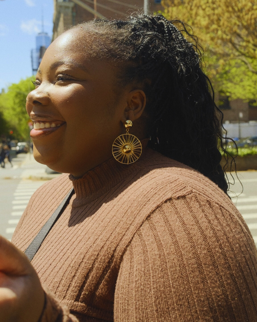 Golden Hour: Our very first piece. A bold, sun-inspired statement earring designed to carry you from day to night. Think: big, gold, warm, and glowing (like golden hour itself). Its sculptural form makes it a head turner, and the intentional construction keeps your lobes comfortable all day.