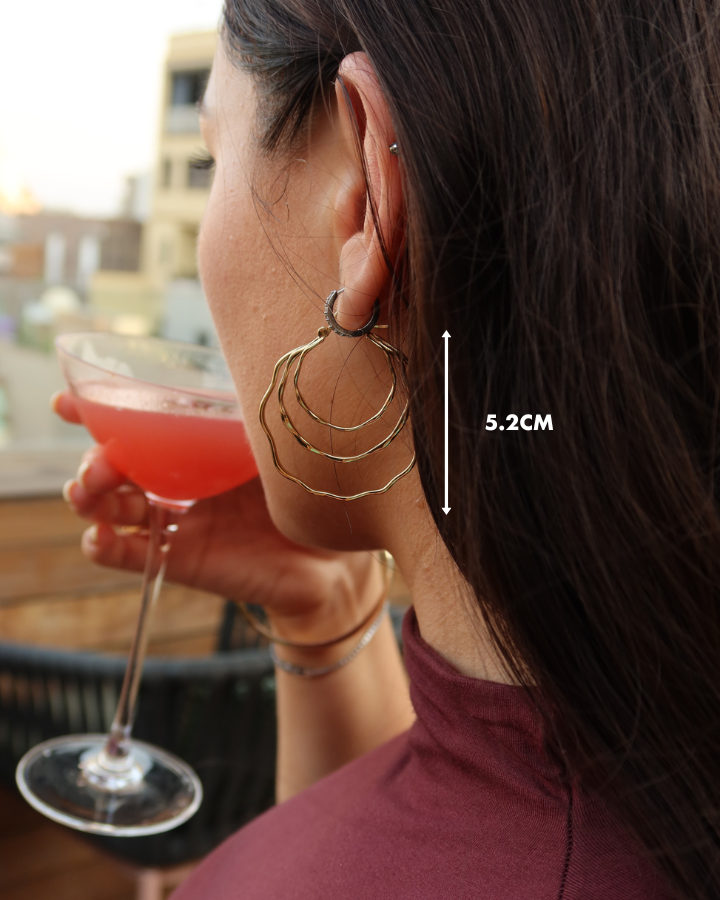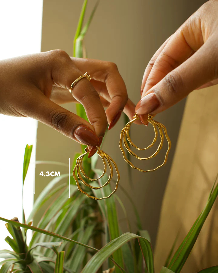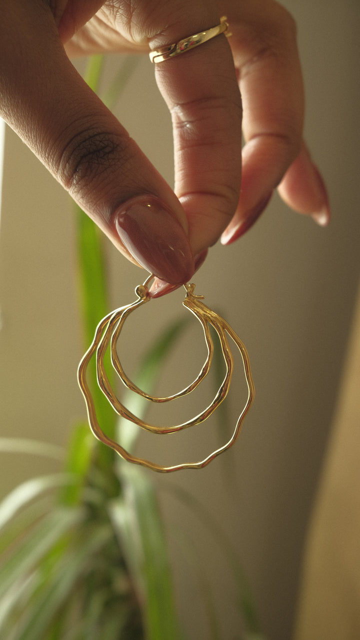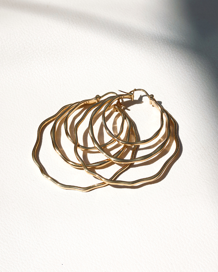 The Signature Wave Hoops take that classic shape and give it a sculptural upgrade. Three stacked, softly curved hoops in one seamless piece. The ripple effect catches the light just right, adding movement without a single part actually moving.